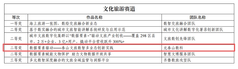 • 喜報!泰山文旅集團元泰山數科團隊獲2025年“數據要素×”大賽山東分賽文化旅游賽道二等獎